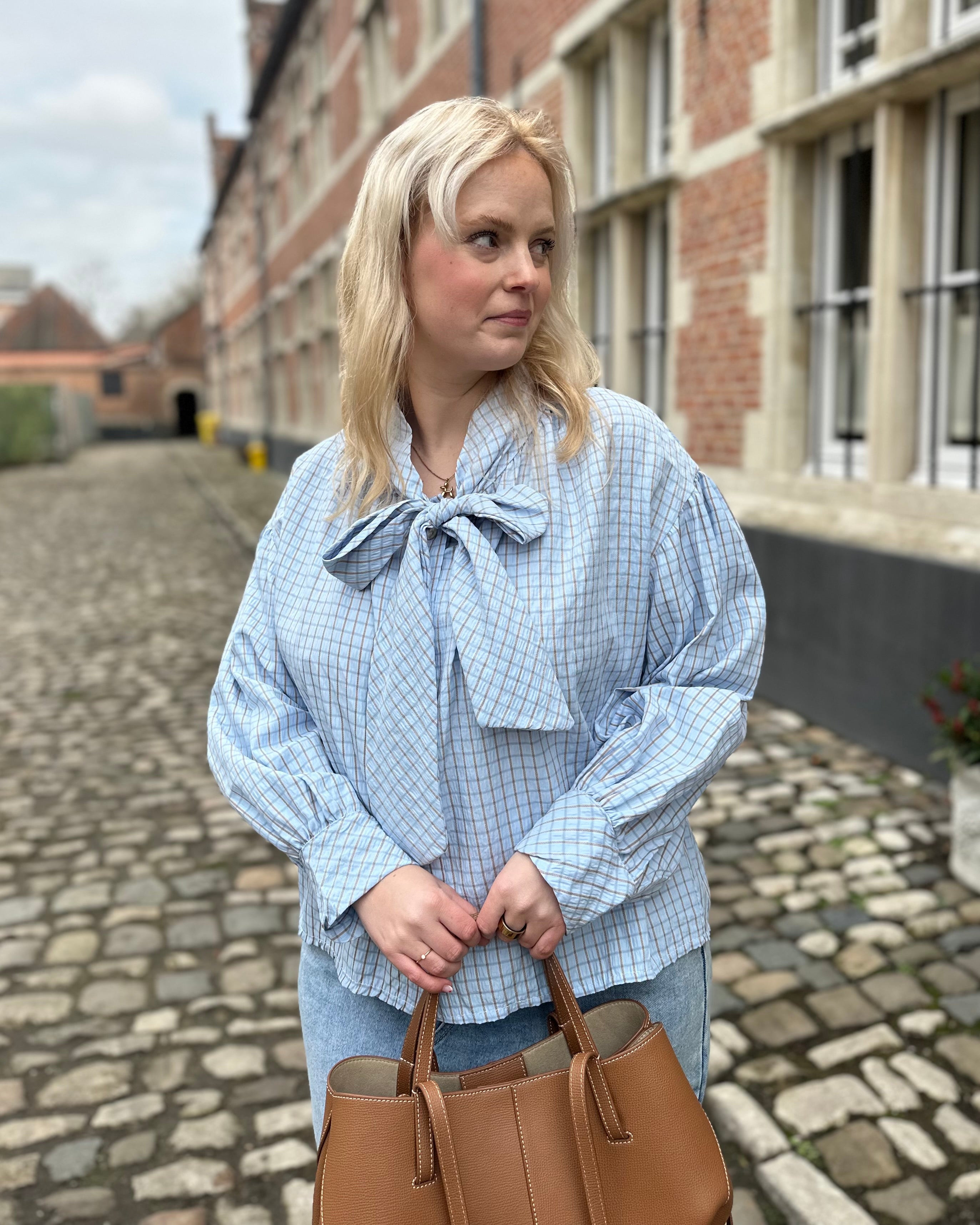 Onze Lina Strikjes Blouse heeft een prachtige blauwe kleuren met fijne bruine ruitjes.